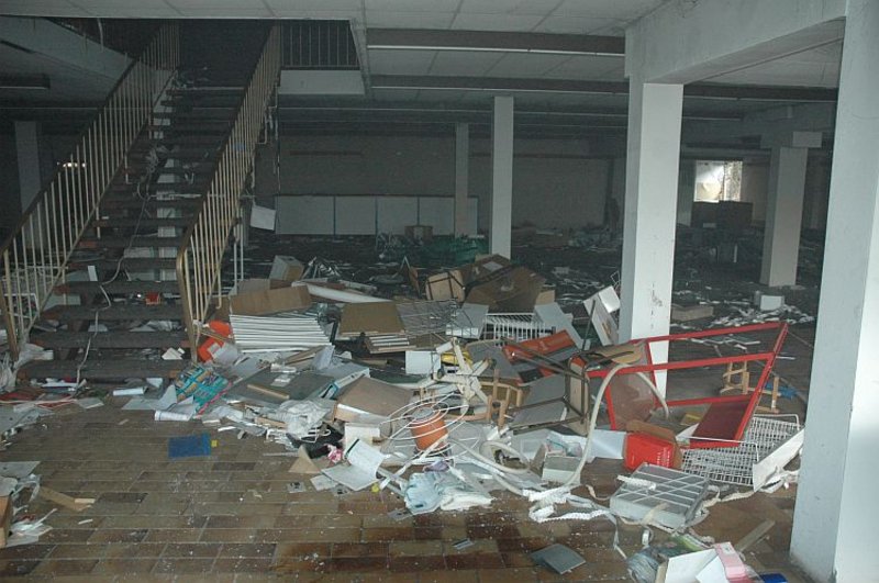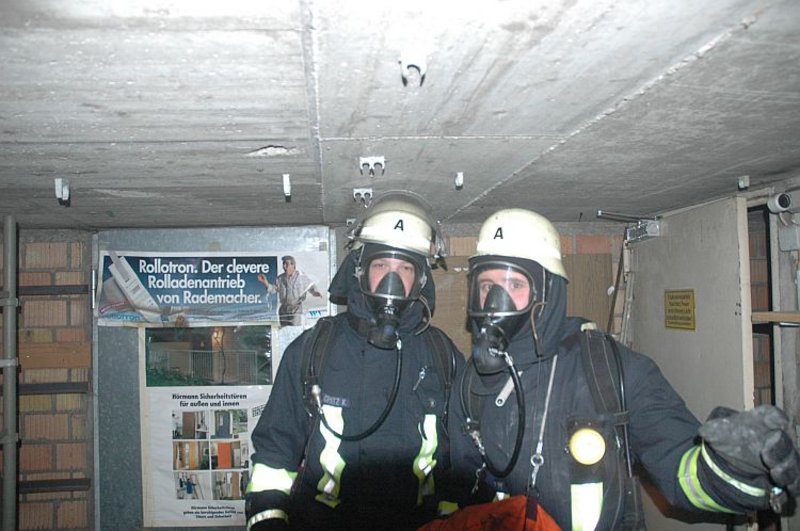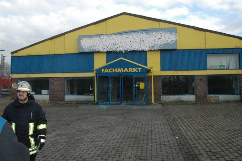 Der erste Angriffstrupp verschaffte sich unter umluftunabhängigen Atemschutzgeräten Zugang zu dem leerstehenden ehemaligen Bauchfachmarkt am Ibbenbürener Bahnhof.