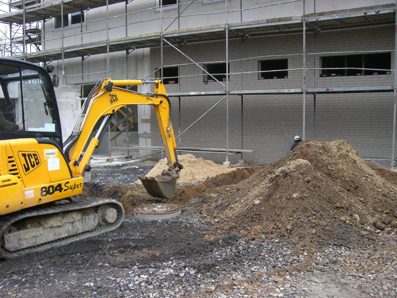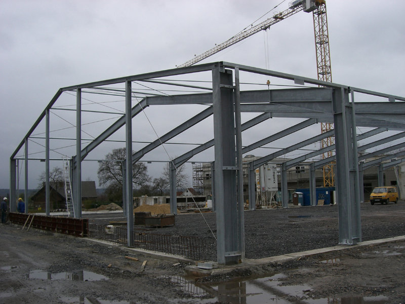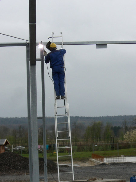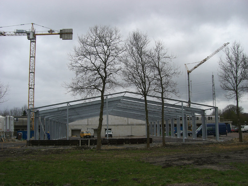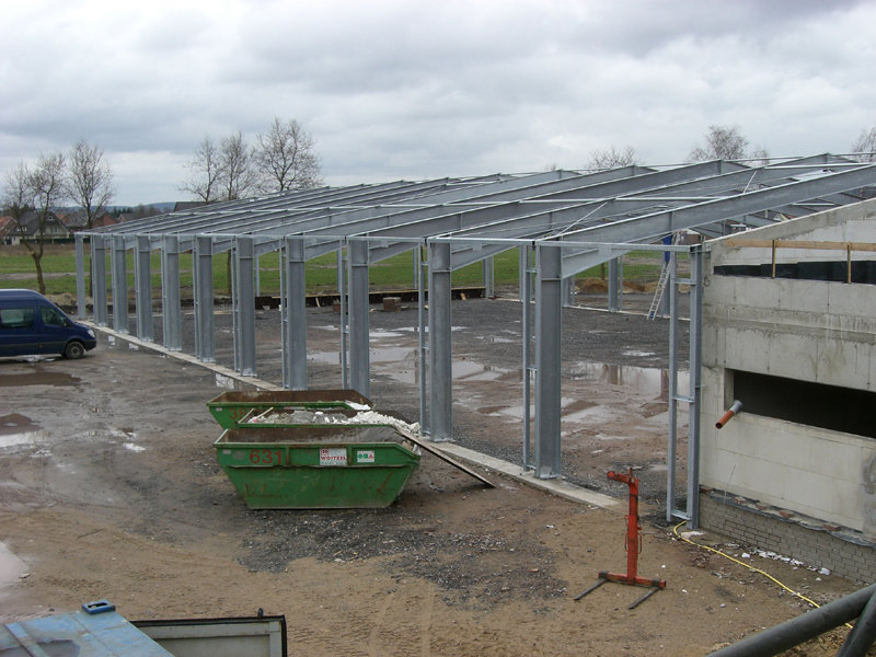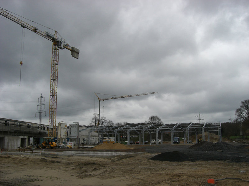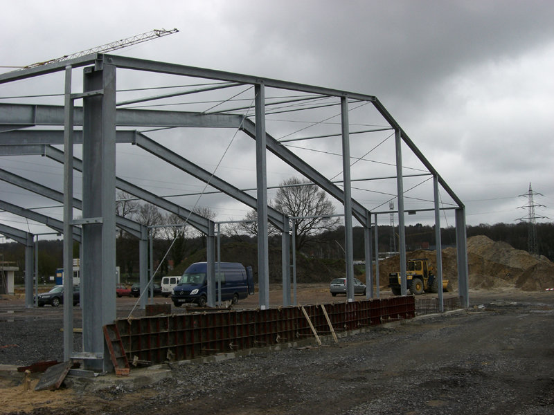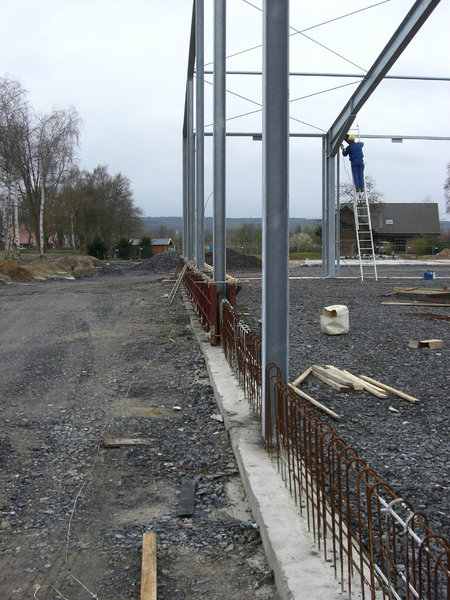 Die Stahlbaukonstruktion der Fahrzeughalle wird ausgerichtet. Im Außenbereich werden weitere Regenwasserleitungen verlegt. Die Klinkerwände und Sockel werden bereits verfugt.