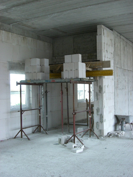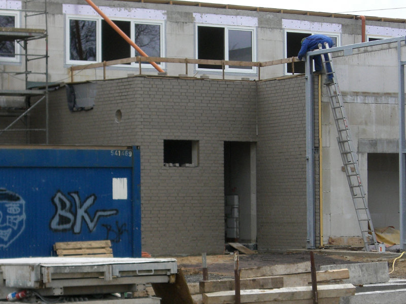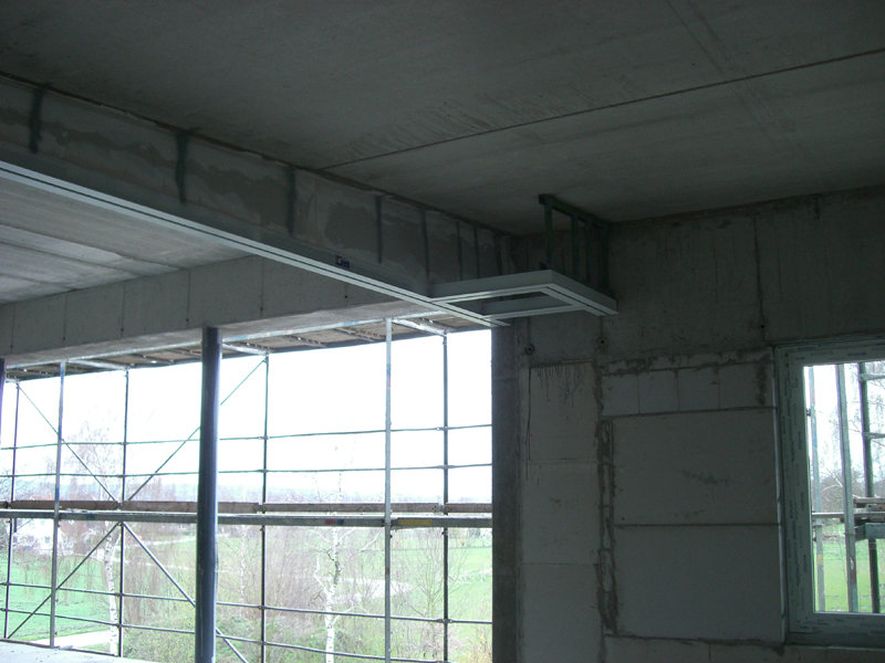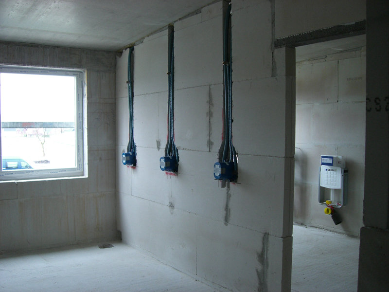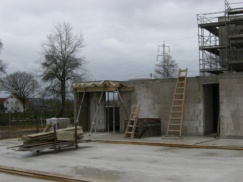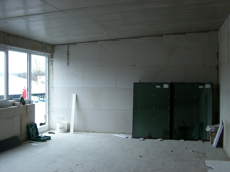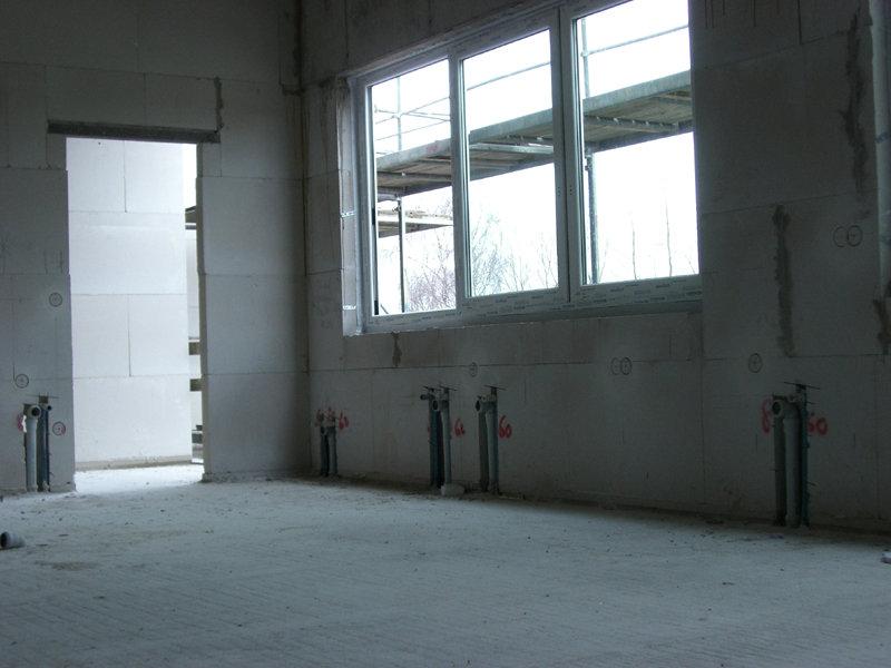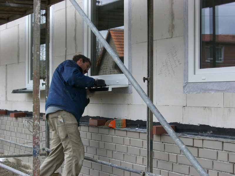 Die Elektro-, Sanitär- und Heizungsfachfirma verlegt weiterhin Leitungen und setzt Steckdosen- und Lichtschalterbohrungen. Der Fensterbauer hat die meisten Fenster bereits eingebaut und montiert die Außenfensterbänke.