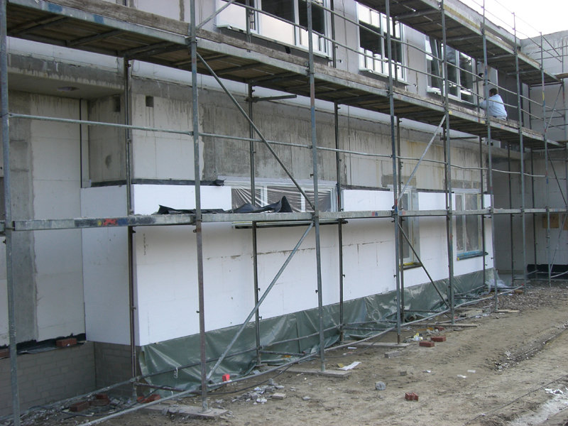 Der Malerbetrieb hat mit dem Anbringen der Fassadenisolierung begonnen.