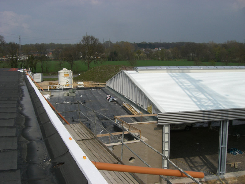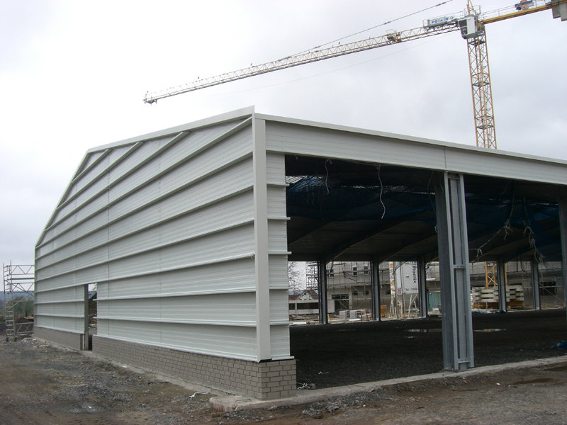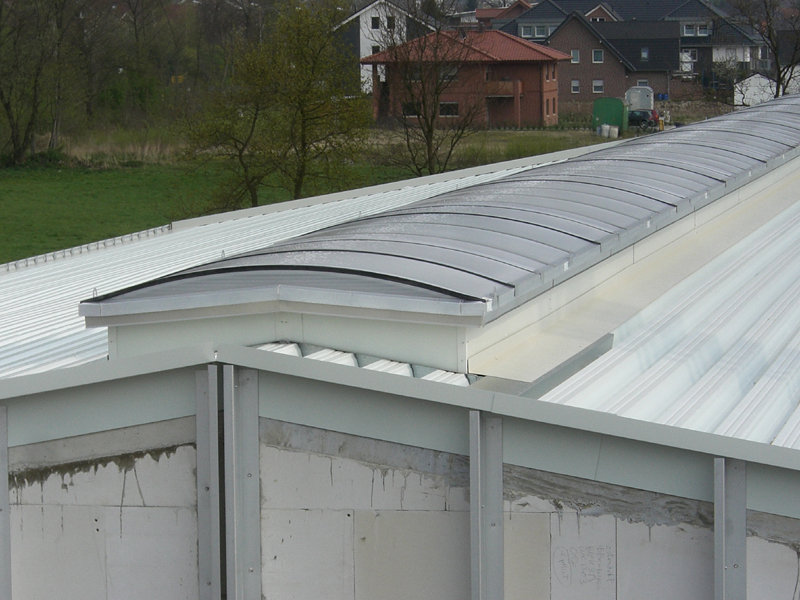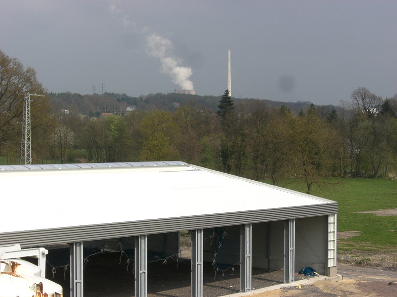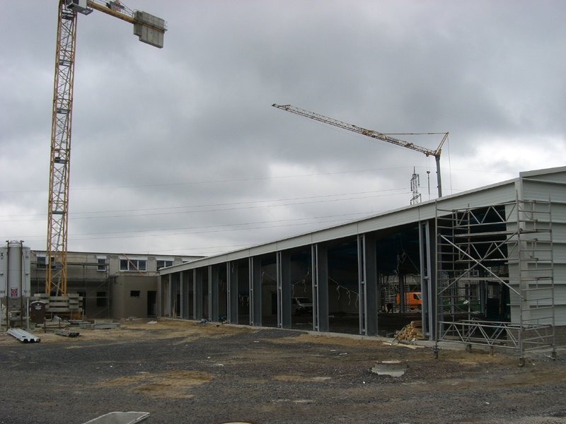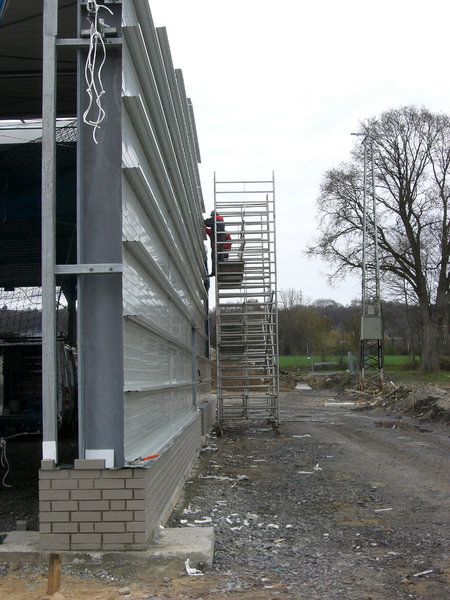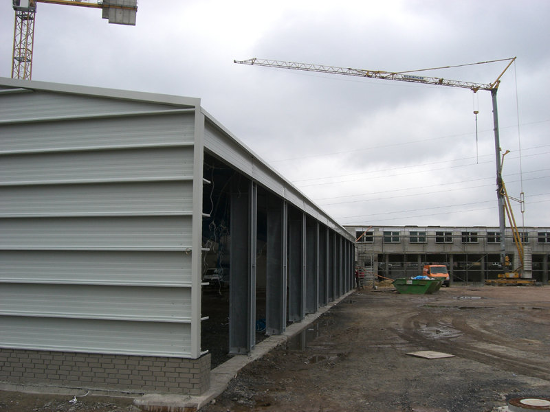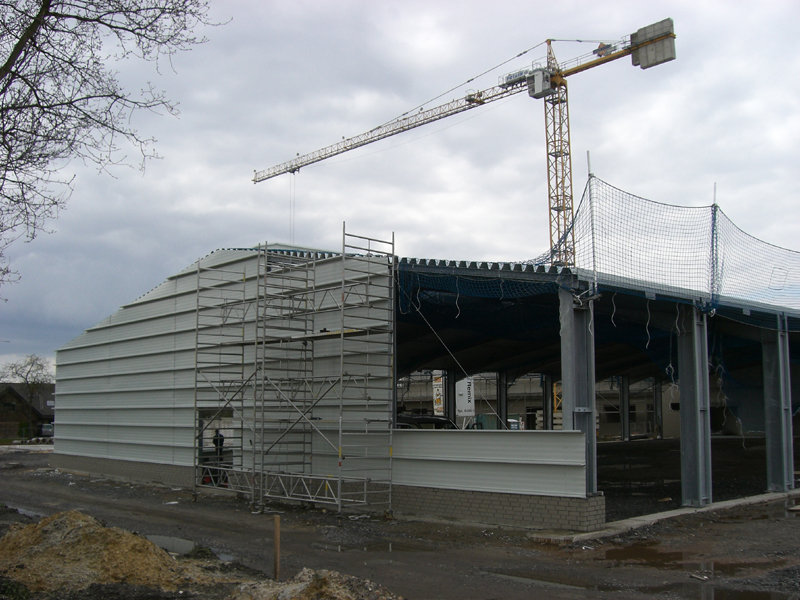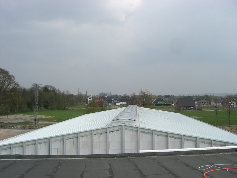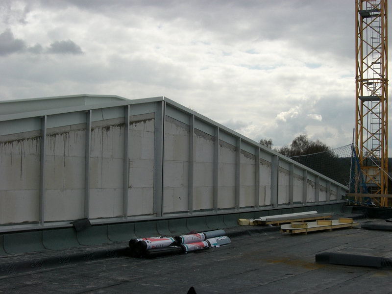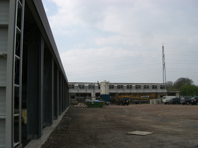 Das Dach der großen Fahrzeughalle ist nun aufgelegt, und die östliche Giebelwandverkleidung angebracht. Das durchgehende Lichtband mit Wärme- und Rauchabzug ist ebenfalls schon fertig montiert.