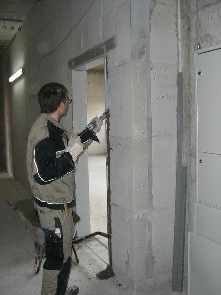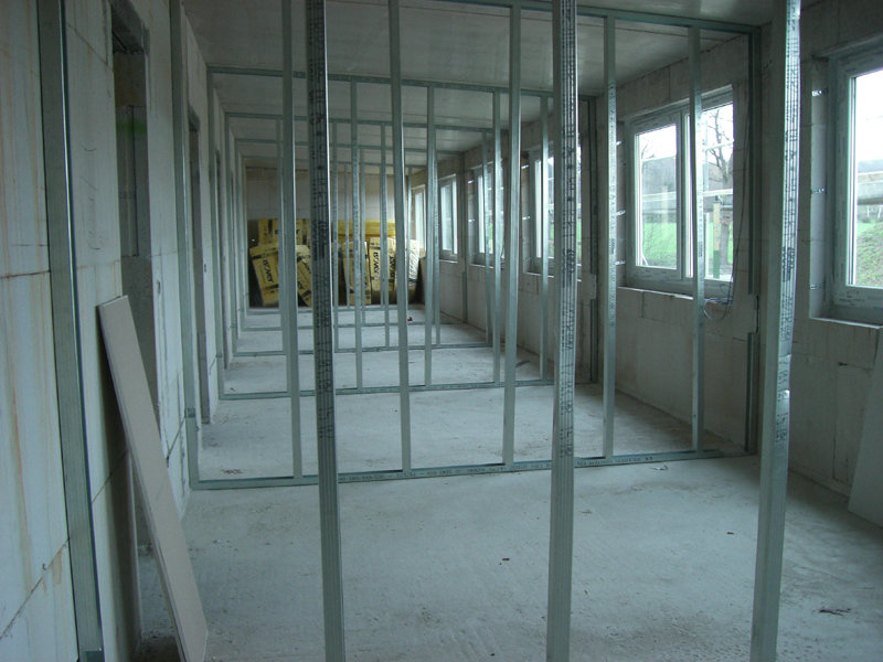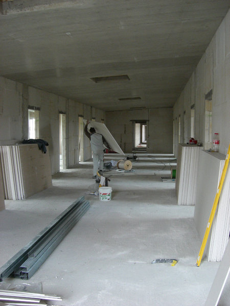 Im Hauptgebäude gehen die Innenausbauarbeiten gut voran. Die Leichtbauwände in den Ruheräumen der hauptamtlichen Kräfte sind sind mittlerweile schon eingebaut. Auch die Elektro-, Sanitär- und Heizungsarbeiten laufen weiter. Ebenso werden zur Zeit die Stahlzargen eingefasst.