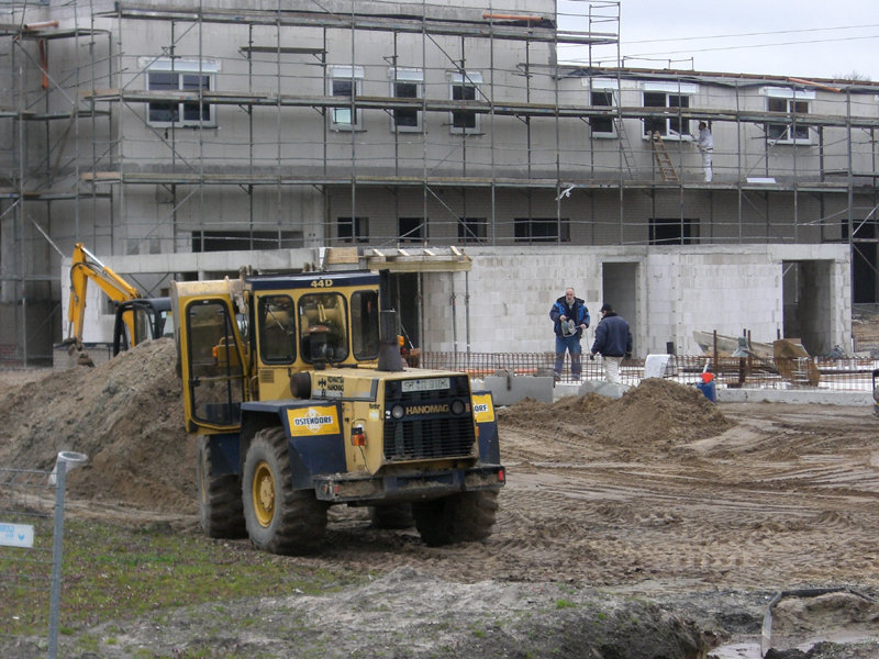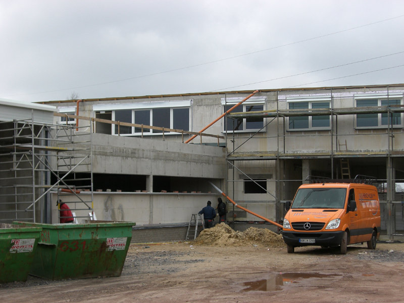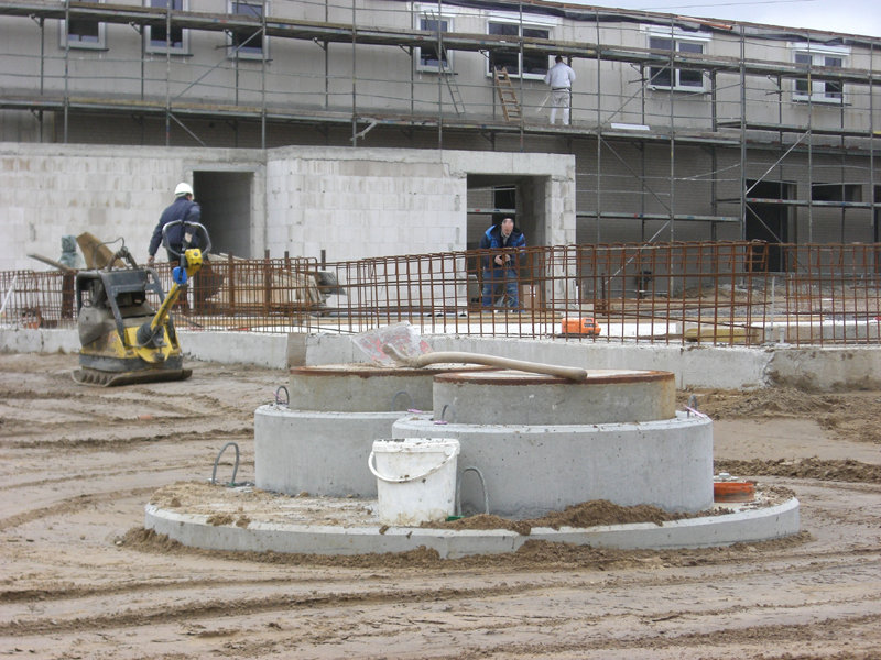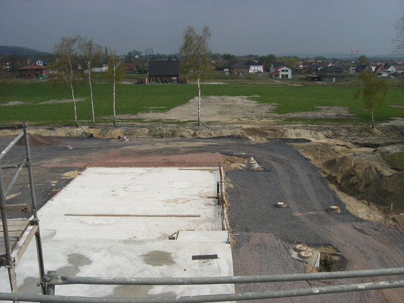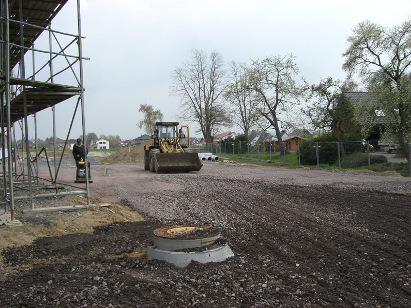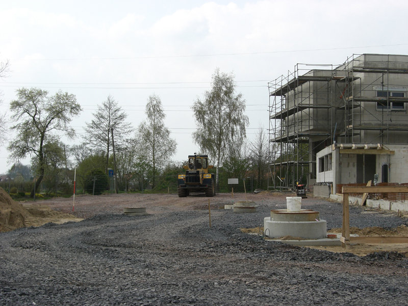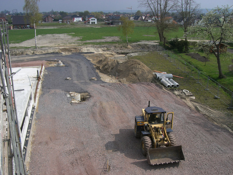 Im Außenbereich sind weitere Abwasserleitungen verlegt, und die ersten Fahrbahn- und Parkplatzflächen mit Schotter versehen worden.