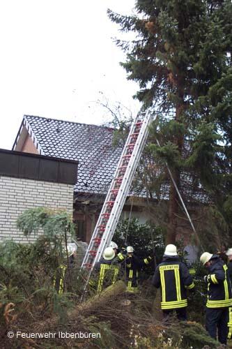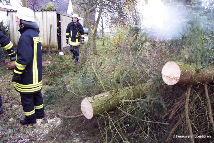 Am Sonntag, dem 27.10.2002, raste ein heftiger Sturm mit Orkanböen über Deutschland hinweg. Auch der Kreis Steinfurt wurde nicht verschont. Gegen Mittag wurden auch in Ibbenbüren die ersten herumfliegenden Dachteile und umgestürzte Bäume gemeldet.Zunächst rückte die alarmierte Wachmannschaft aus, zu der dann aber recht bald die Freiwillige Feuerwehr nachalarmiert wurde, da die Zahl der gemeldeten Schäden immer größer wurde. Von Dörenthe bis Uffeln erstreckte sich das Einsatzgebiet. Ein Schwerpunkt waren die höher gelegenen Stellen auf dem Dickenberg bzw. in Bockraden. Aber auch eigentlich geschütztere Stellen, wie die Groner Allee direkt hinter der Autobahn, wurden nicht verschont: hier wurde eine 20 Meter hohe Birke derart entwurzelt, dass sie die geteerte Fahrbahn gleich mit aufriss.