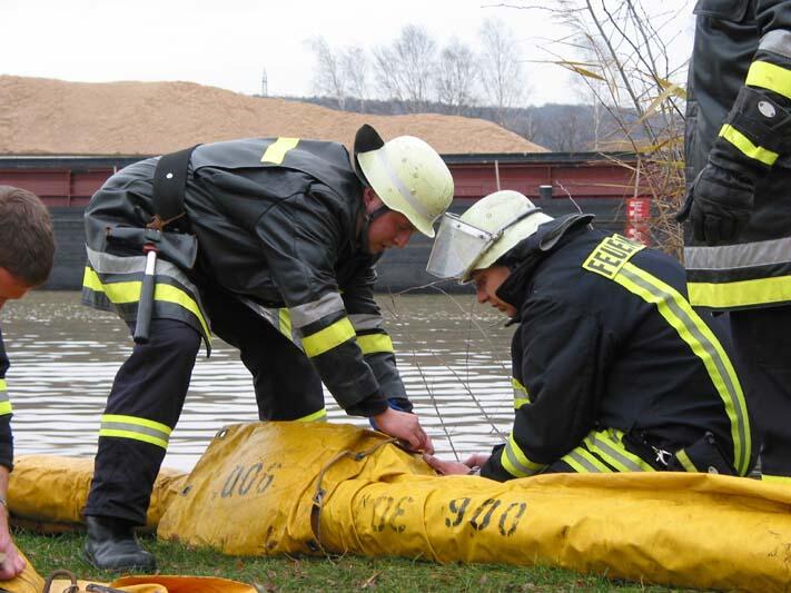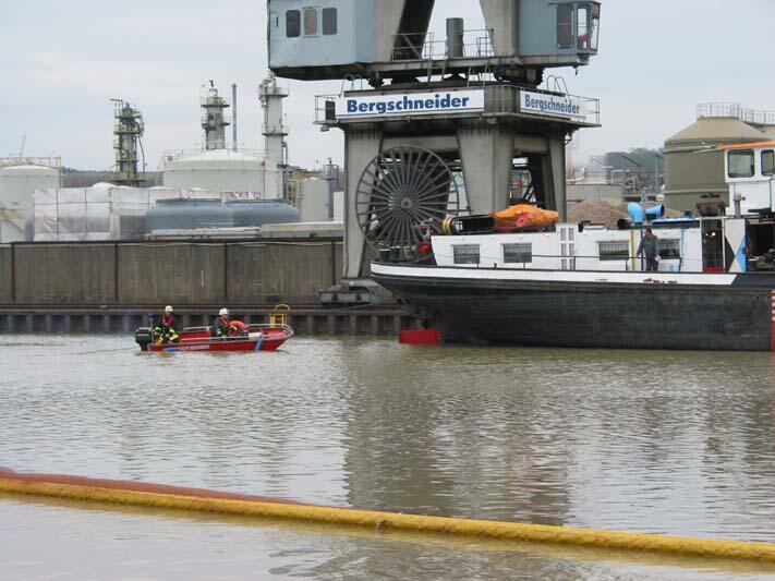 Mit dem Motorboot waren Reinhold Artmeier und Ralf Ernschneider auf dem Kanal unterwegs, um beim Ausbringen der Schläuche zu unterstützen. Während am Schüttwerk Westermann das Ausbringen noch problemlos war, gestaltete es sich am Hafen Bergschneider etwas schwieriger, weil dort noch Schiffe den Kanal befuhren. Hier wurde zunächst die Sperre in weitem Bogen ausgelegt, ehe Bindemittel verwendet wurde. Nach und nach wurden die Schläuche enger gezogen und das Öl von der Firma Woitzel abgesaugt. Gegen 14.00 Uhr war der Einsatz beendet.