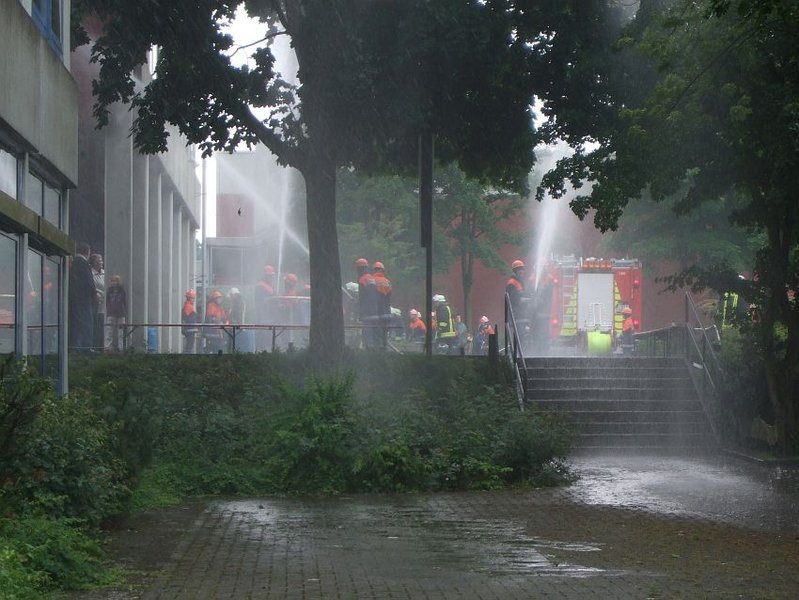 Angenommene Lage war der Vollbrand einer Schule in Horstmar der durch Dachdeckerarbeiten ausgelöst worden ist. Im Gebäude wurden noch einige Schüler vermisst. Des Weiteren war eine großzügige Wasserversorgung aufzubauen.