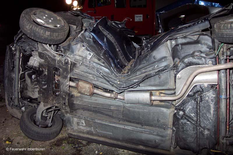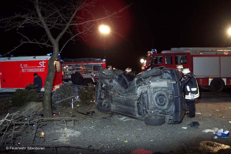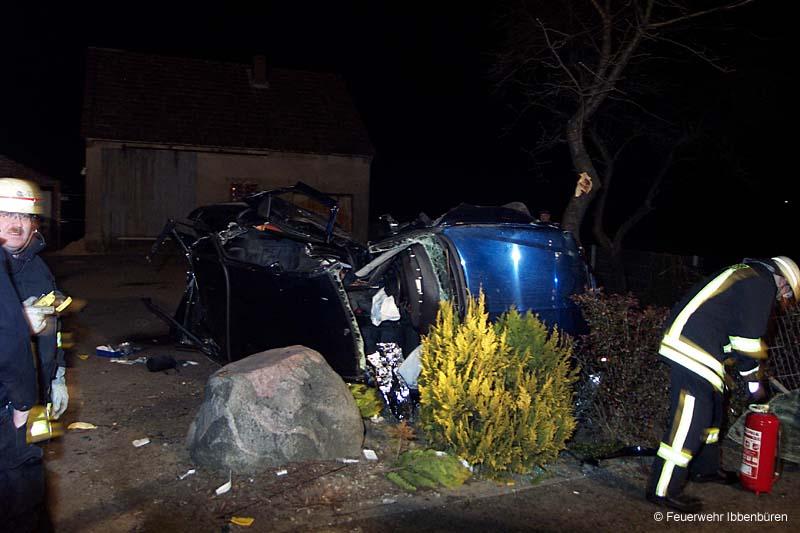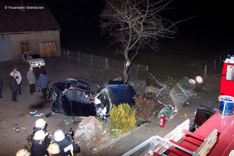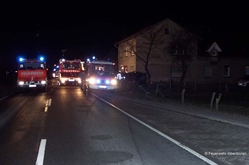 Weil er einem Hasen ausweichen wollte war der 18-jährige Fahrer eines Pkw mit seinem Wagen von der Straße abgekommen und dort in einem Vorgarten gegen Steine und einen Baum geprallt. Vorher überfuhr er noch ein Verkehrsschild und einen Zaun. Der Wagen kam auf der Seite zum Liegen und der Fahrer wurde im Fahrzeug eingeklemmt.Zunächst wurde das Fahrzeug gegen weiteres Wegrollen gesichert. Dann wurde der Patient durch die zuvor geöffnete Windschutzscheibe im Fahrzeug notärztlich versorgt. Parallel dazu wurde ein Teil vom Zaun entfernt, um besser an das Fahrzeug zu gelangen und die Fahrzeugbatterie wurde abgeklemmt. Auch wurde mit einem C-Rohr der Brandschutz gestellt. Dann konnte das Dach des Pkw mittels Rettungsschere soweit geöffnet werden, dass eine Befreiung des Fahrers möglich wurde.