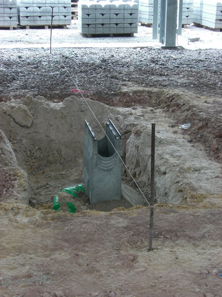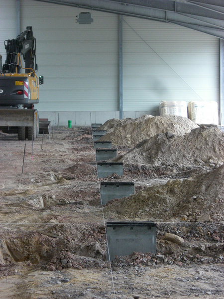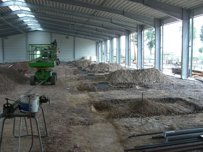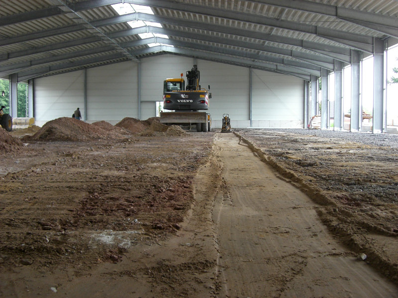 In der Fahrzeughalle werden derzeit die Entwässerungsleitungen und die Ablaufrinnen eingebaut. Danach wird die Betonsteinpflasterung eingebracht.