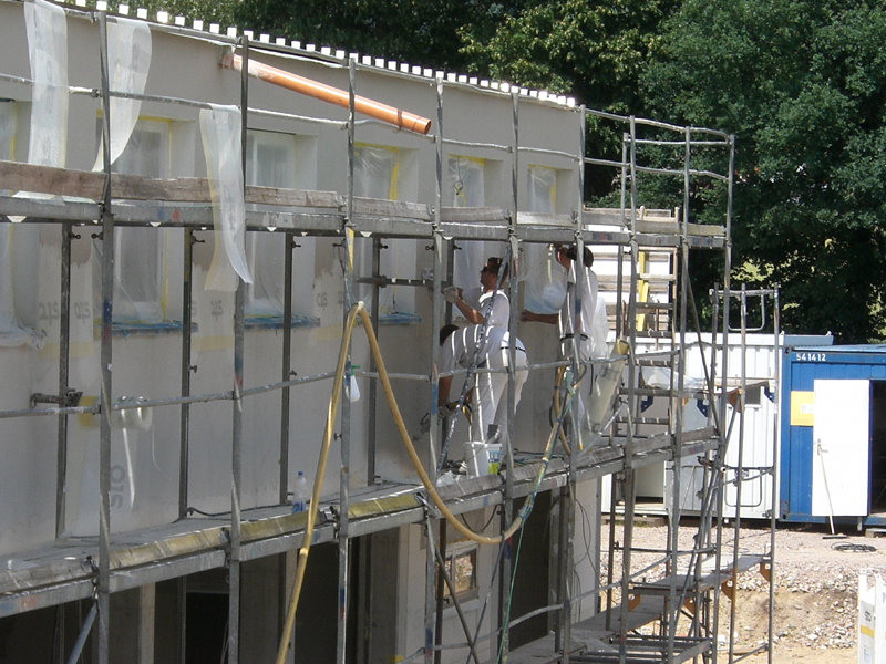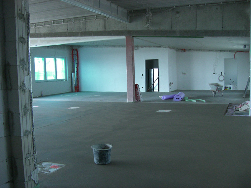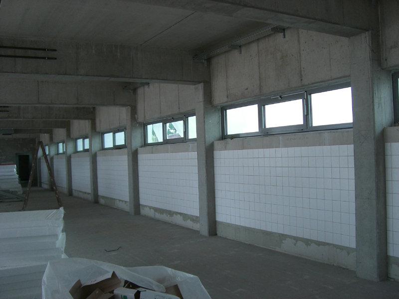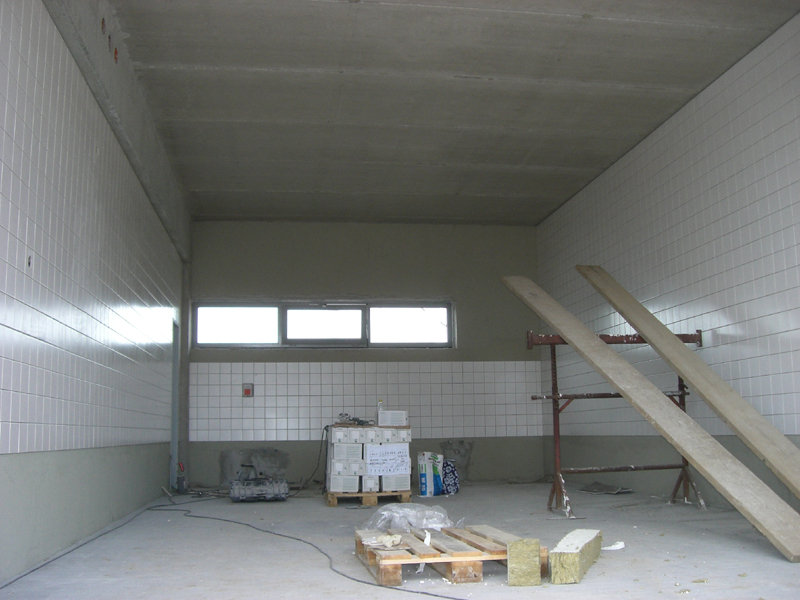 Die Ausbauarbeiten im Hauptgebäude gehen weiter gut voran. Es wird weiter Estrich verlegt, Wände werden verputzt, Fliesen verlegt. Die Elektriker und Heizungsbauer verlegen weiterhin ihre Leitungen unter den Decken. Im Heizungsraum wird zur Zeit der Kohlebunker montiert.